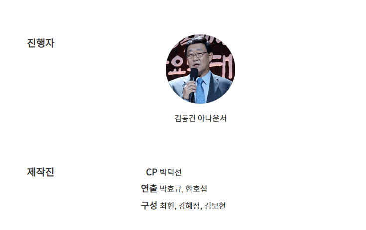 답변2 가요무대는 다양한 주제로 구성됩니다. 계절, 사랑, 가족, 명절 등 다양한 테마를 중심으로 방송됩니다.