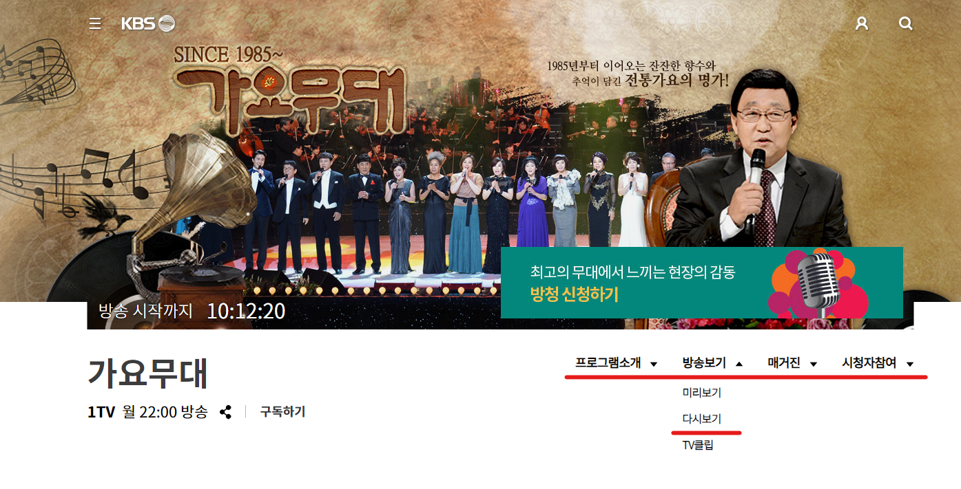 4. 가요무대 페이지에서 방송보기ㅡ다시보기를 클릭합니다.